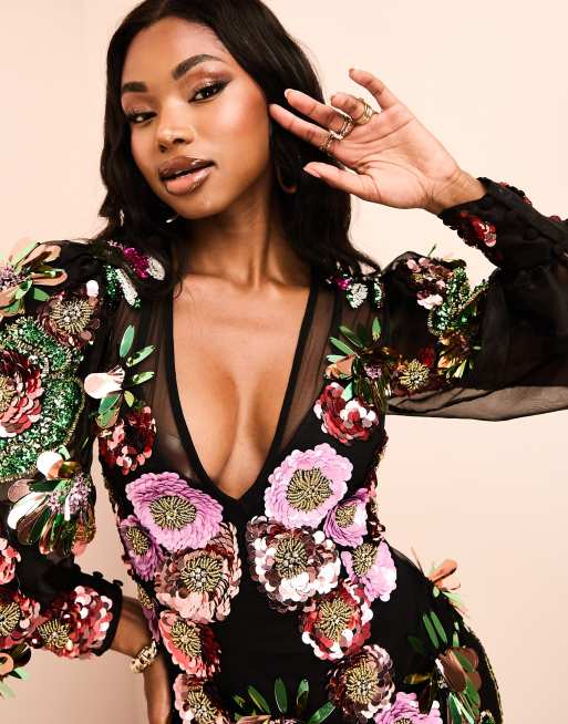ZAFUL Floral Embroidered Sheer Mesh Long Sleeve Dress In BLACK Very well made.