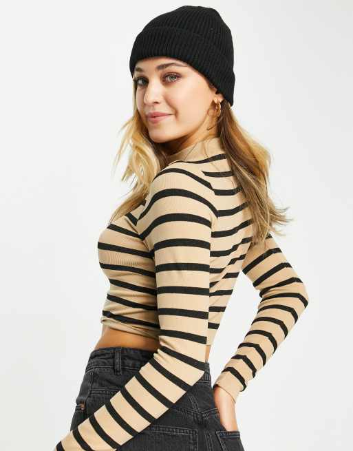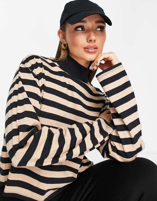 ASOS DESIGN high neck boxy long sleeve top in camel and black stripe Very well made.