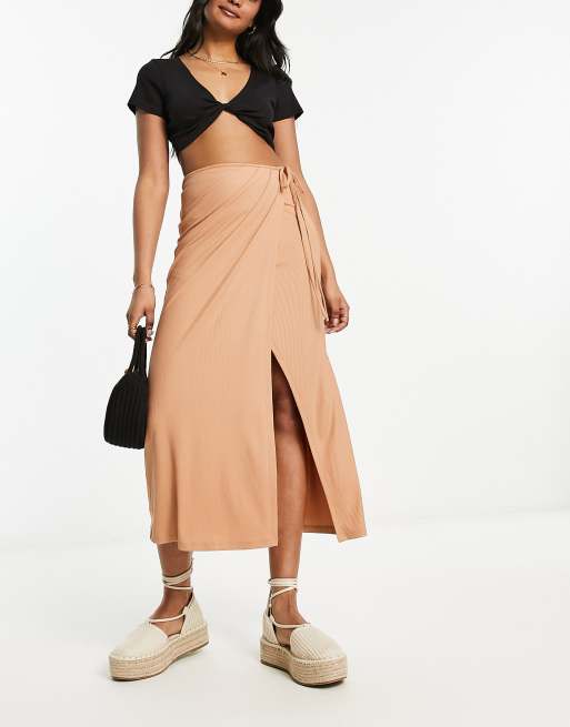 JDY wrap sarong ribbed midi skirt in camel Very well made.