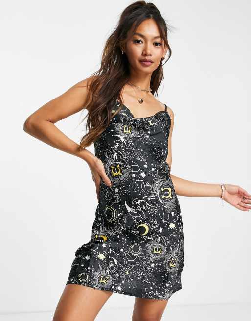 Wednesday s Girl mini slip dress with cowl neck in celestial print satin Very well made.
