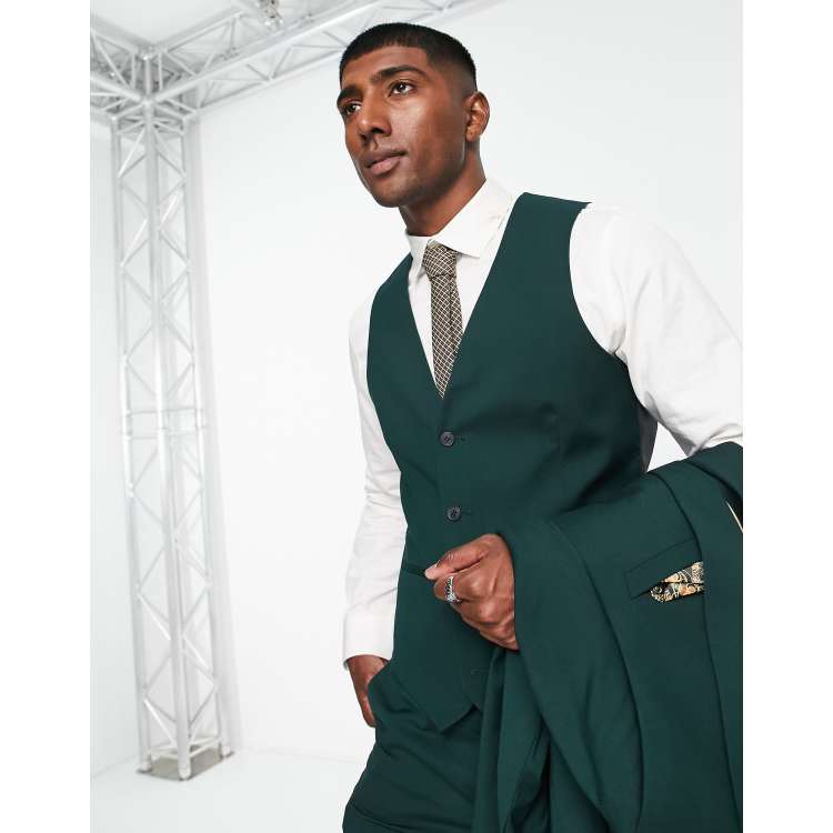 ASOS DESIGN wedding skinny wool mix suit waistcoat in dark green herringbone Very well made.