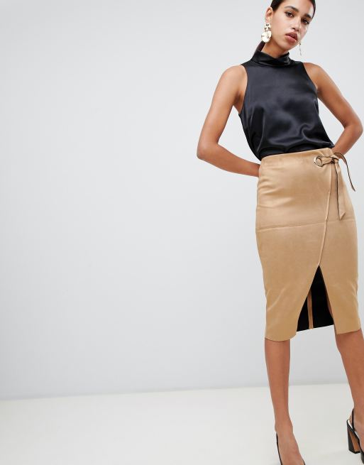 River Island faux suede wrap front pencil skirt in light camel Very well made.