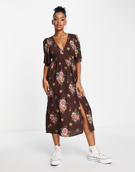 Monki midi tea dress with split in brown floral print Very well made.