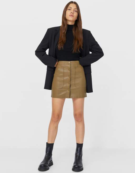 Stradivarius faux leather button front mini skirt in khaki Very well made.