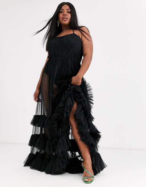 Lace Beads Plus embellished bodice tiered tulle maxi dress in black Very well made.