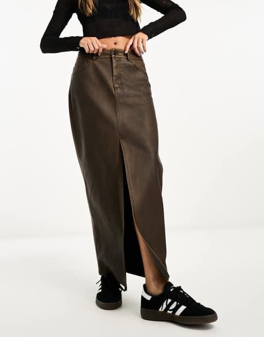 Stradivarius faux leather midi skirt with split front in washed brown Very well made.