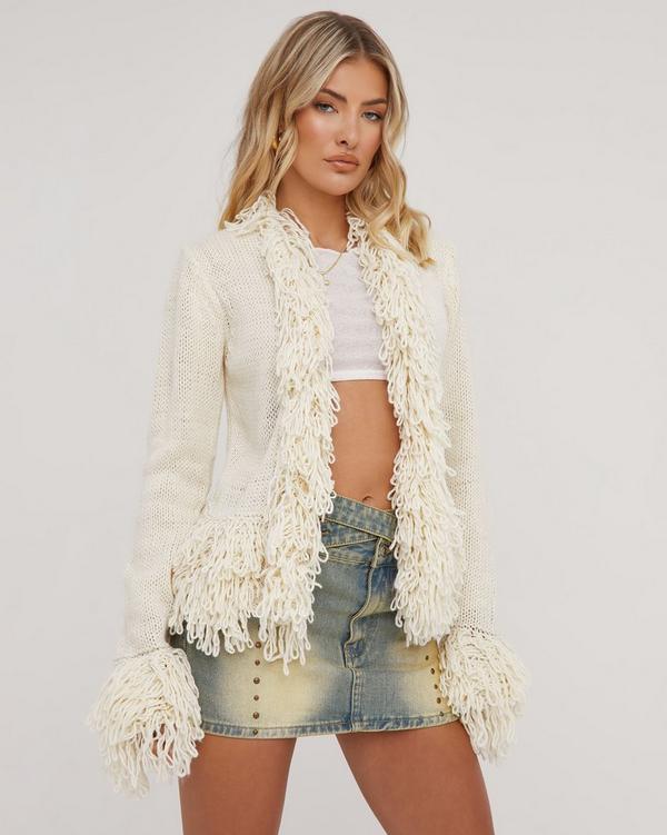 Long Sleeve Fringe Trim Detail Cardigan In Cream Knit Very well made.
