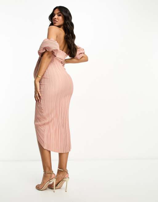 ASOS DESIGN Maternity off shoulder wrap plisse midi dress in soft pink Very well made.