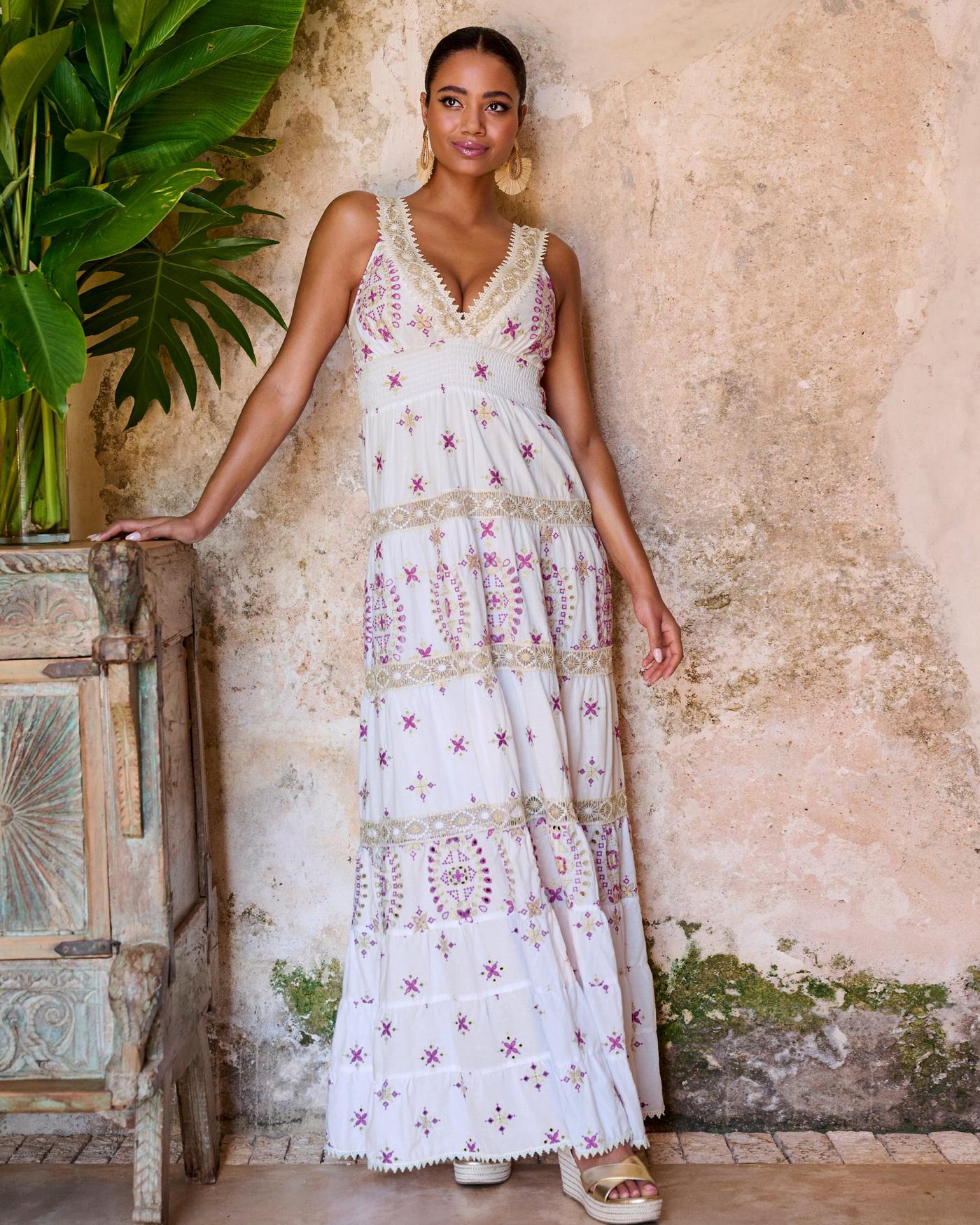 Metallic Lace Inset Eyelet Maxi Dress White Purple Multi Very well made.