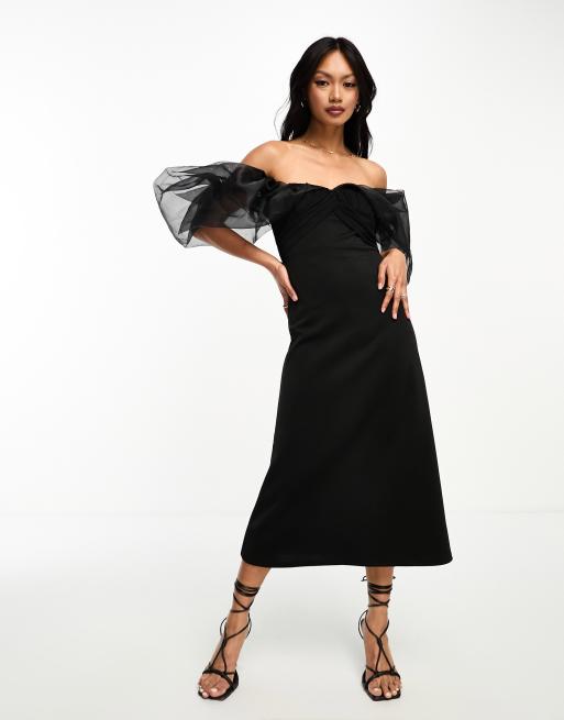 ASOS DESIGN off shoulder organza puff sleeve soft line midi dress in black Very well made.