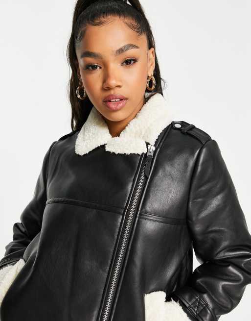 Pimkie Giubbotto stile aviatore in pelle sintetica nera con finiture in pile borg a contrasto Very well made.