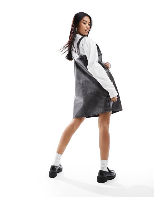 Monki mini pinafore slip dress in distressed black faux leather Very well made.