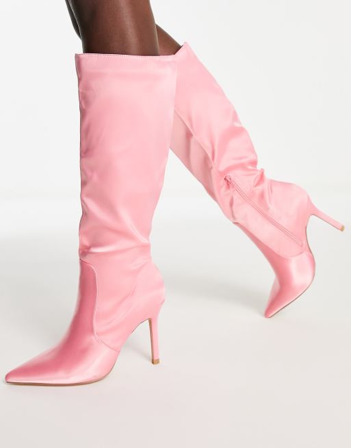 Public Desire Wide Fit Best Believe knee high heel boots in pink satin Very well made.