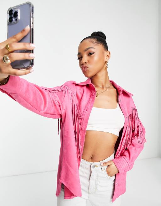Stradivarius suedette fringed jacket in pink ASOS Very well made.