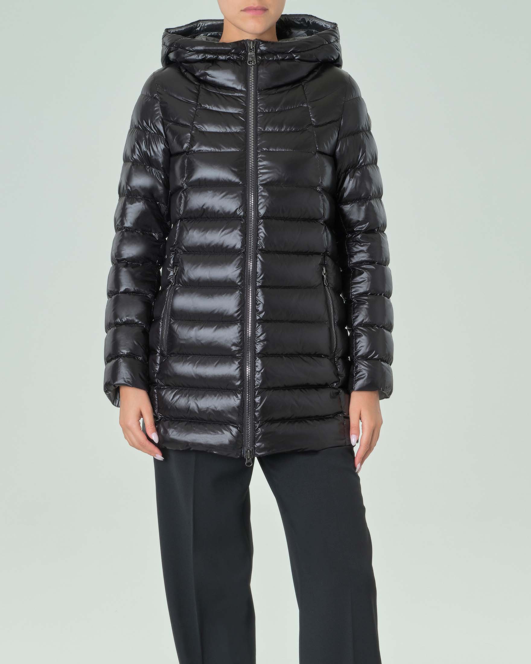 Piumino lungo color nero con cappuccio fisso e fodera interna grigia Very well made.