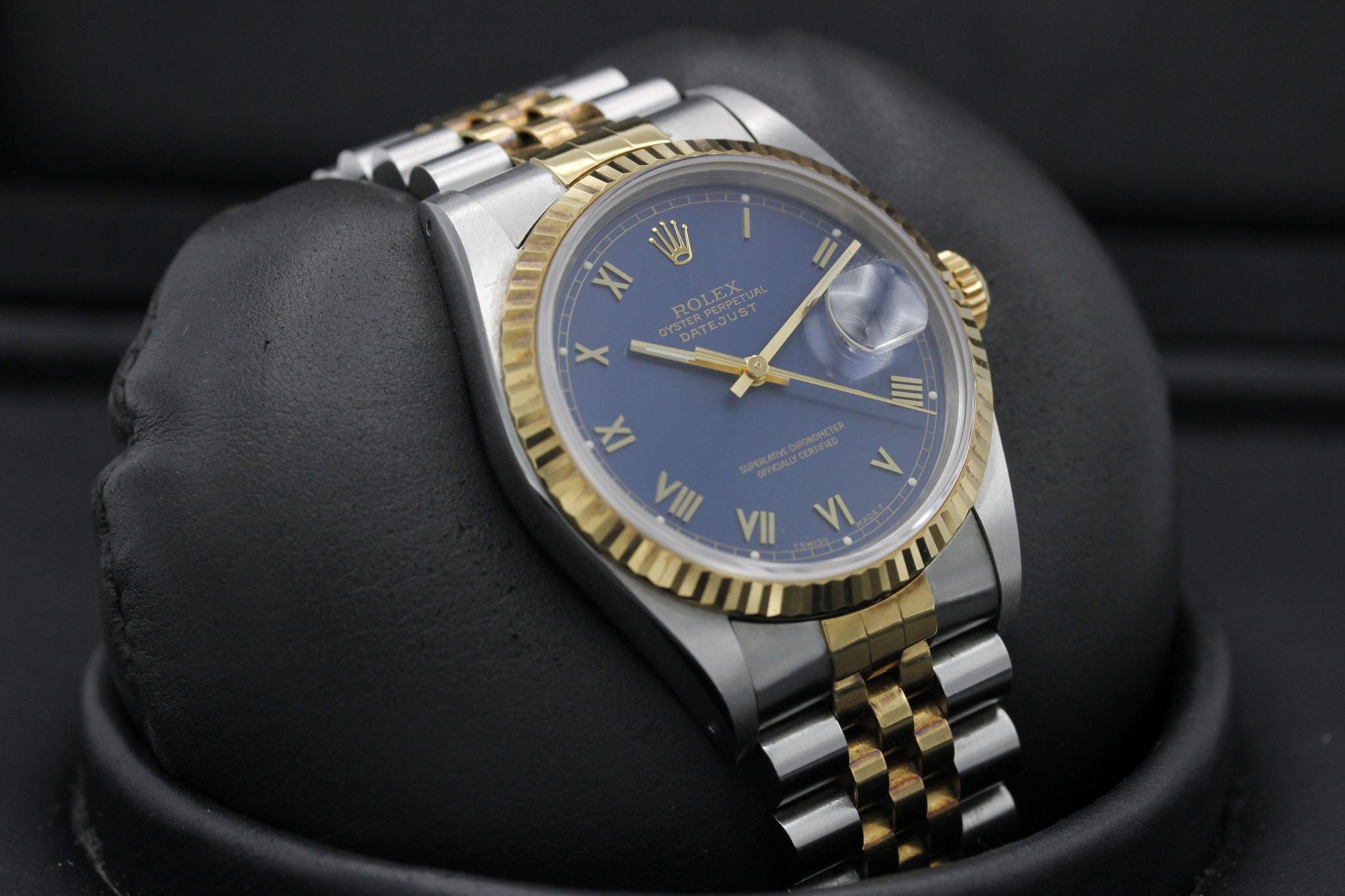 Rolex Mens Datejust 16233 18K Gold Steel Blue Vignette Diamond Dial 2 Tone Watch Very well made.