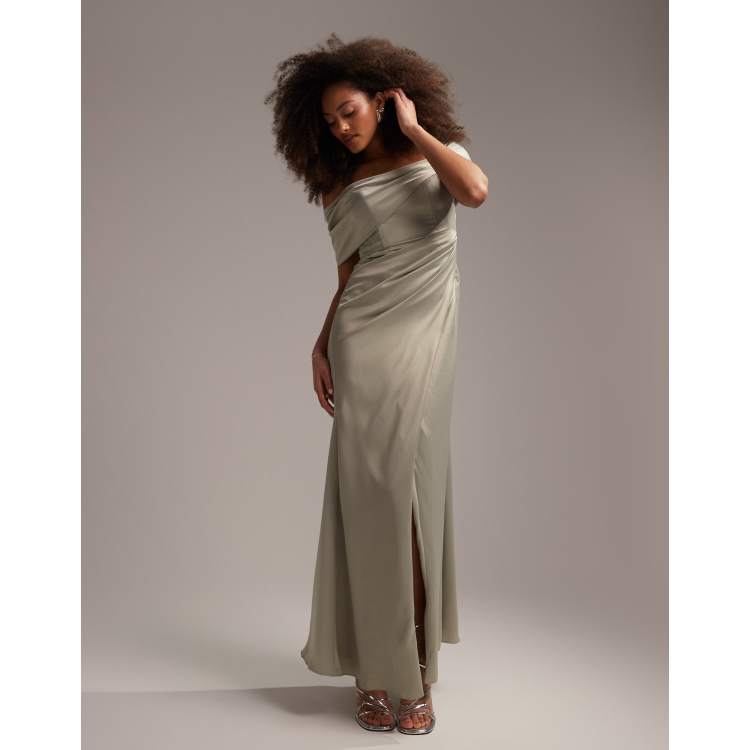 ASOS DESIGN Bridesmaid satin bardot drape wrap maxi dress in sage green Very well made.