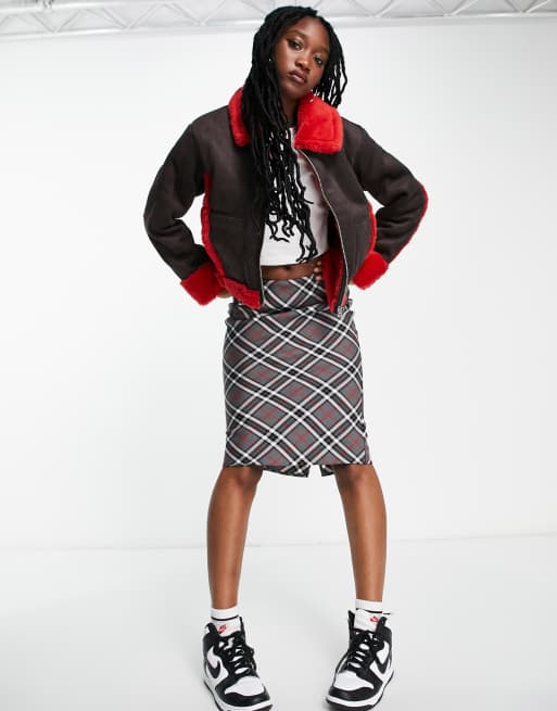 Weekday Enzo suedette bonded faux shearling jacket in brown with red contrasts Very well made.