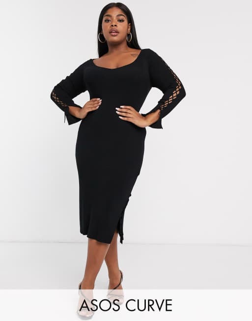 ASOS DESIGN Curve ribbed midi dress with v neck and lace up sleeve Very well made.