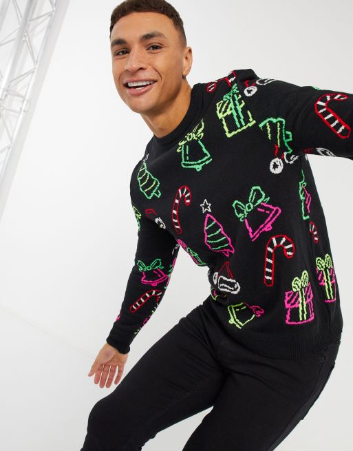 ASOS DESIGN knitted christmas jumper with all over neon motifs Very well made.