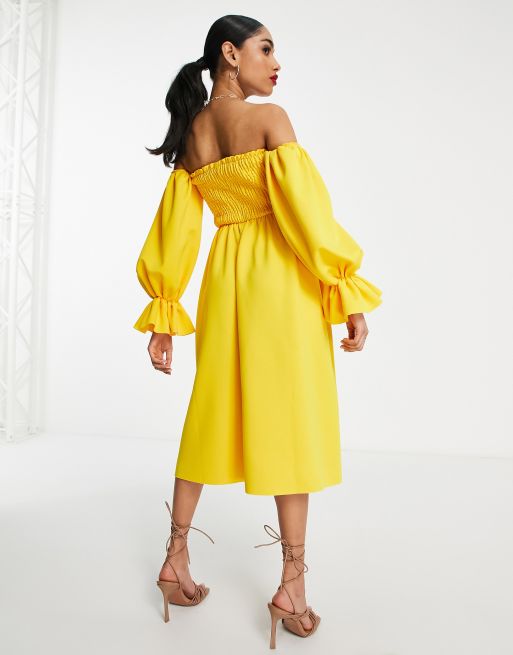ASOS DESIGN Petite shirred bardot blouson sleeve prom midi dress in lemon Very well made.
