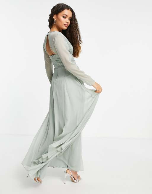 ASOS DESIGN Petite Demoiselle d honneur Robe longue manches longues avec taille fronc e et jupe pliss e Olive Very well made.