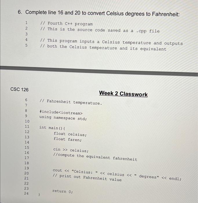 Solved 6. Complete line 16 and 20 to convert Celsius degrees Very well made.